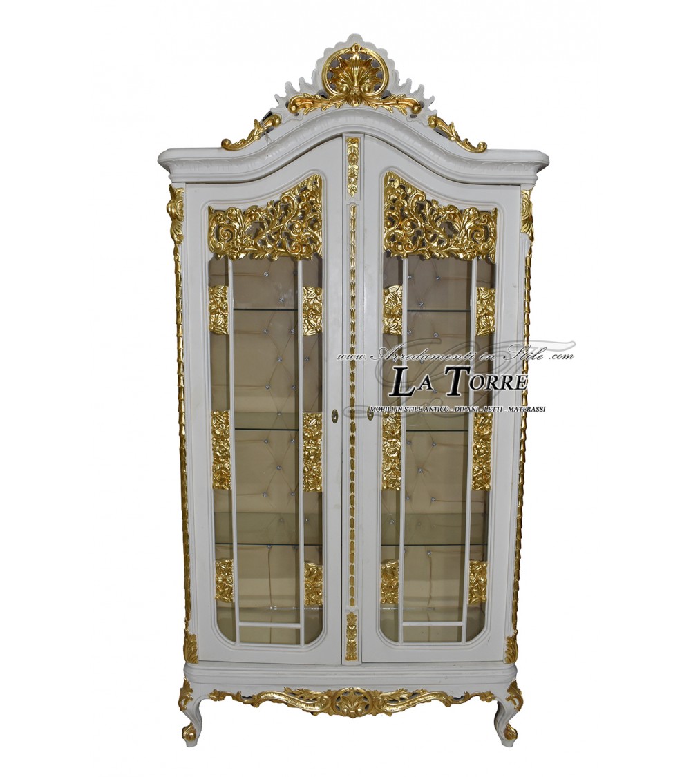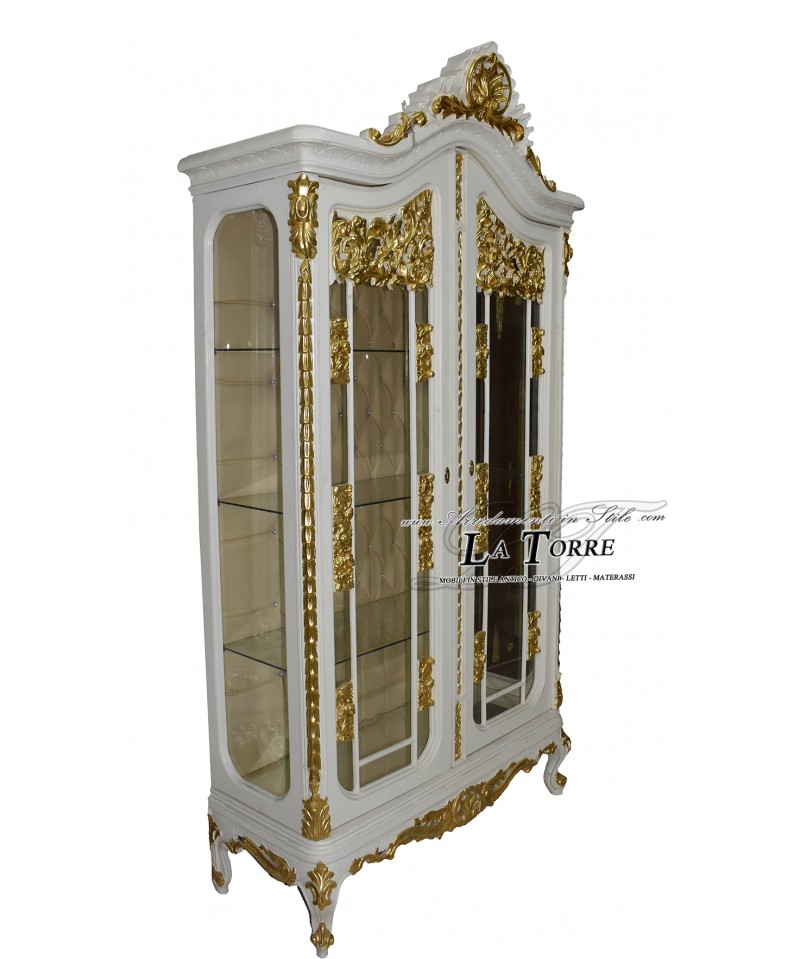 Vetrina cristalliera in stile barocco , caratterizzata da una struttura del mobile in legno, laccata in un delicato colore bianco magnificamente contrastata e arricchita da abbondanti applicazioni di foglia oro sui dettagli intagliati. Gli intagli sono estremamente elaborati e si trovano lungo la cimasa superiore, con motivi floreali, che ne definiscono la sagoma maestosa. Le cornici delle due ante vetrate, le fasce decorative tra i pannelli e la base curva inferiore sono anch'esse riccamente dorate e intagliate. Le ante seguono la forma del mobile, e dotate di vetri trasparenti. L'interno della vetrina presenta uno sfondo imbottito da un ecopelle champagne con una lavorazione capitonné che crea un effetto trapuntato, con mensole in vetro per riporre gli oggetti.