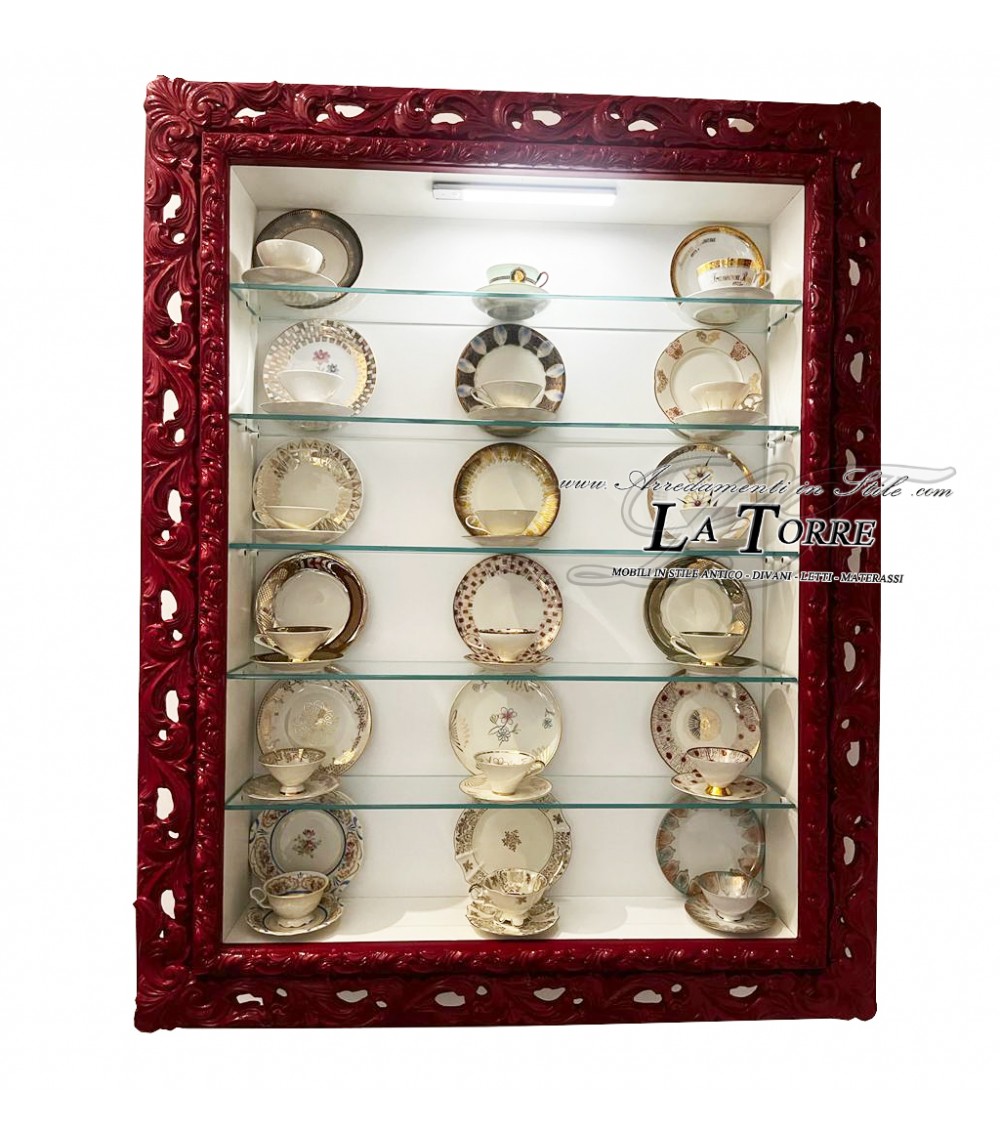 Vetrina sospesa da parete stile Barocco cornice traforata box Tv portabottiglie su misura VTGGR