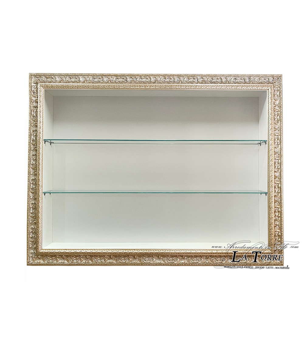 Vetrina sospesa da parete bacheca stile Barocco cornice argento anticato box porta tv su misura VTD621