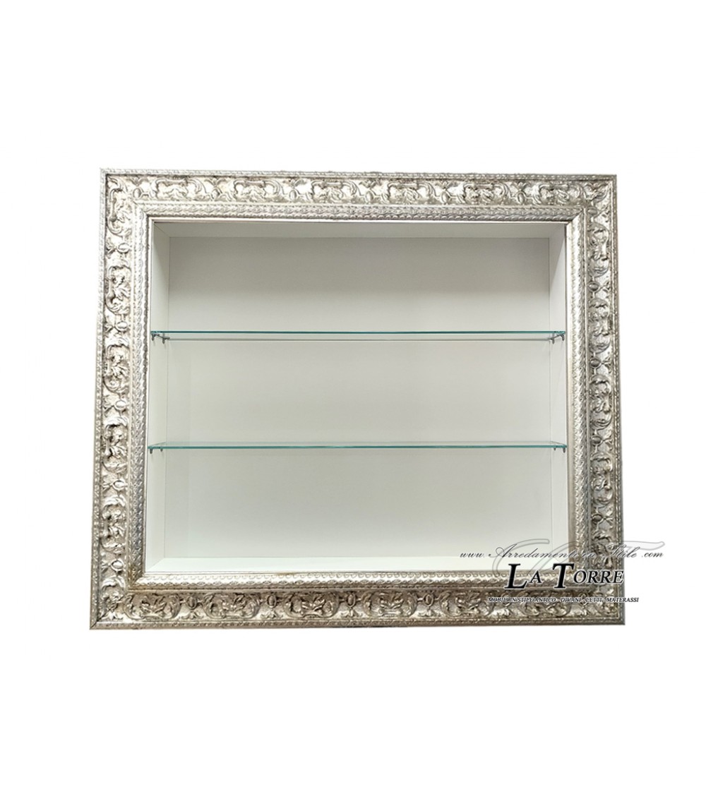 Box vetrina da parete rettangolare in stile barocco, con una cornice in foglia argento decorativa con motivi intagliati che le conferiscono un aspetto classico ed elegante.