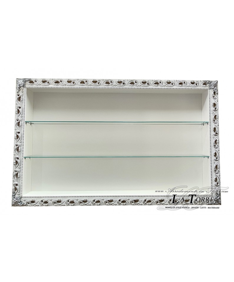 La cornice è finemente traforata e presenta decorazioni elaborate in legno bianco con particolari argento, tipiche dello stile barocco. L'interno della vetrina è di colore bianco e presenta due ripiani in vetro sottili, creando tre spazi espositivi. La vetrina sembra essere pensata per essere fissata al muro e potrebbe essere utilizzata per esporre oggetti decorativi, collezioni o come mobile porta TV su misura. L'aspetto generale è elegante e ricercato, in linea con l'estetica del mobile classico italiano.