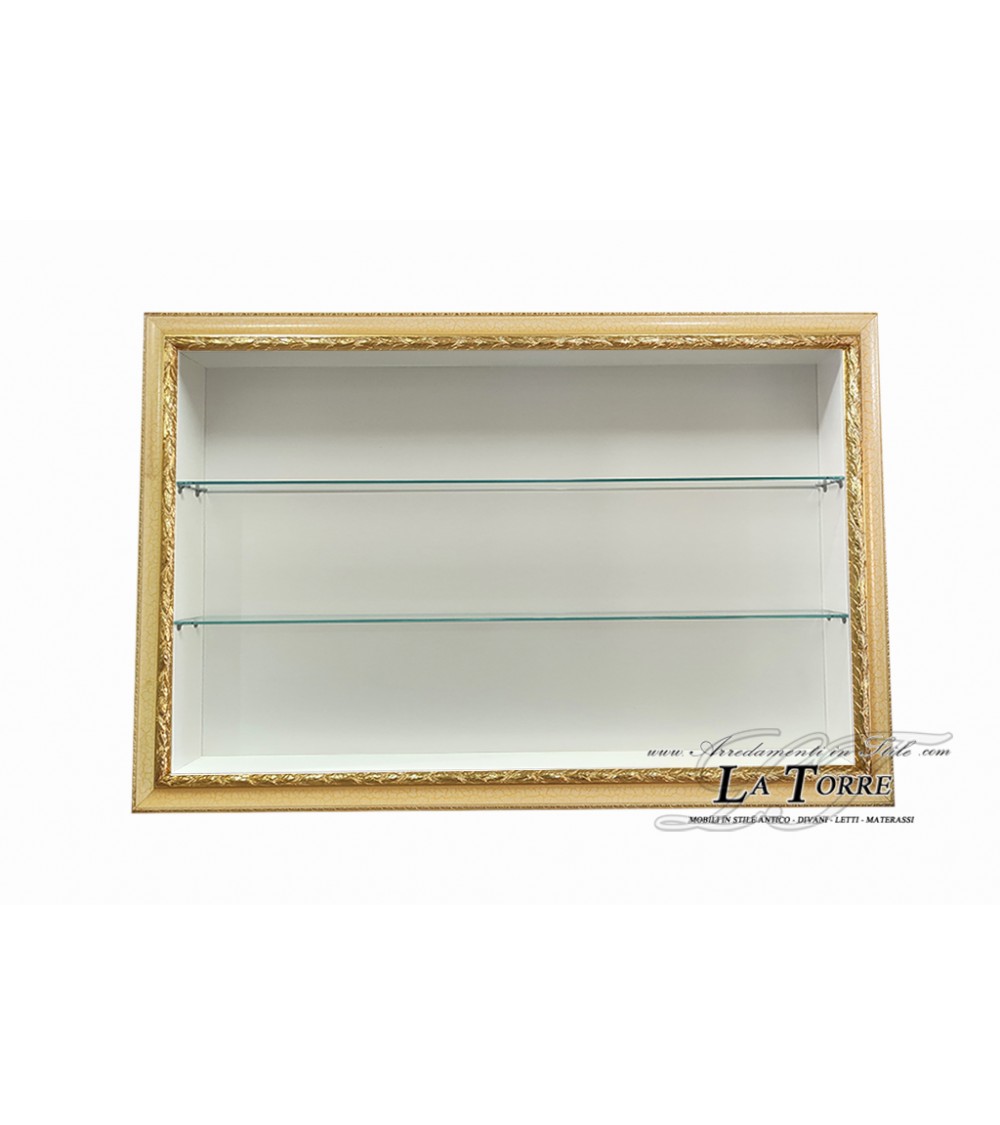 Vetrina classica sospesa da parete dal design elegante e raffinato. La sua forma rettangolare allungata è definita da una cornice in legno con una finitura avorio con accenti dorati effetto cracklè . La cornice presenta una lavorazione decorativa lungo i bordi, con motivi che suggeriscono intagli o applicazioni in rilievo, aggiungendo un tocco di classicità e pregio.