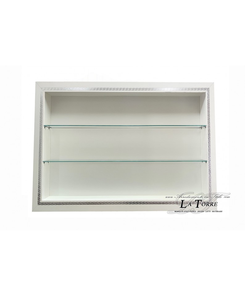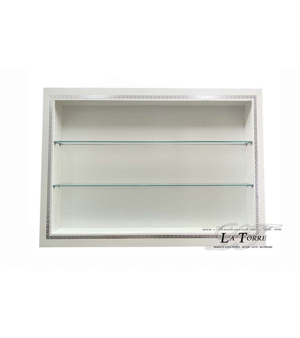 Vetrina classica sospesa , caratterizzata da un design elegante con una cornice bianca ornata da un distintivo motivo a meandro greco lungo tutto il perimetro. L'interno della vetrina è suddiviso in tre ripiani orizzontali in vetro trasparente, offrendo quattro livelli di spazio espositivo. La parte posteriore della vetrina è di colore bianco uniforme, creando uno sfondo neutro per gli oggetti che verranno esposti.