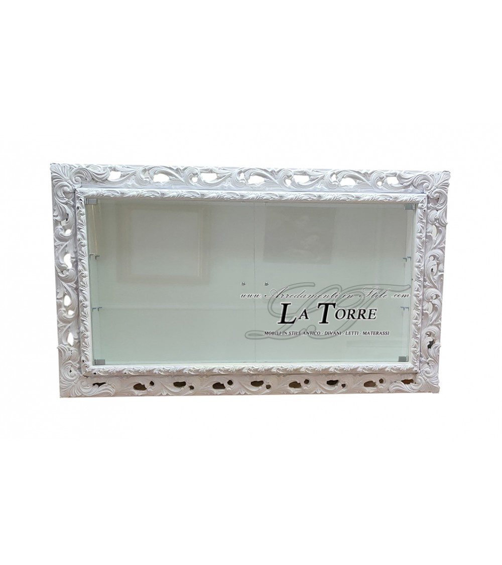 Vetrina sospesa da parete con ante in vetro stile Barocco cornice traforata portabottiglie caratterizzato da elaborate decorazioni a volute e motivi fogliacei. La finitura bianca della cornice conferisce un aspetto lussuoso e riflettente. Il mobile è dotato di due ante in vetro con piccole maniglie centrali in metallo argentato. Attraverso il vetro si intravede l' interno bianco suddiviso in scomparti, suggerendo la possibilità di esporre oggetti di diverse dimensioni. La cornice presenta un design traforato in alcune sezioni, aggiungendo un elemento di dettaglio e leggerezza visiva. La combinazione dello stile barocco opulento con la finitura bianca crea un pezzo d'arredamento che potrebbe aggiungere un tocco di eleganza classica e contemporanea a un ambiente.